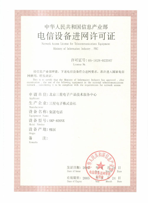 当前位置:首页 > 走进至泰 > 资质荣誉 > 三星集团电话SKP-820NX电信设备进网许可证