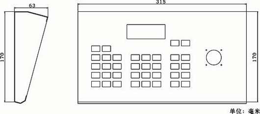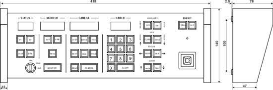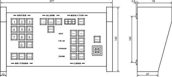 LCD窗口指示着目前所选的现场,摄像机及监视器以及从键盘输入的数字,键盘还包括一个内部蜂鸣器,收到报警后会鸣5秒。