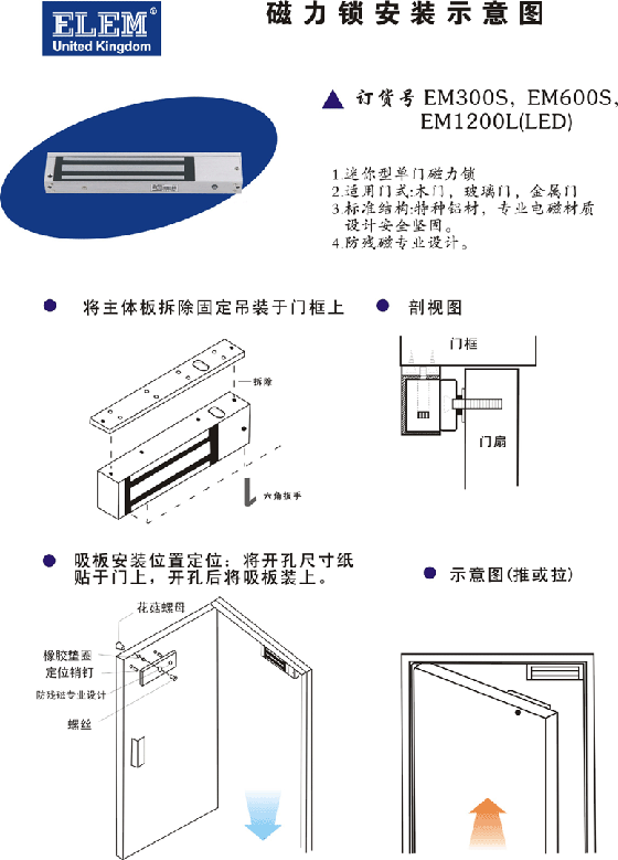 苏州多玛自动门,天津盖泽,深圳必盛,广州瑞可达,南京史丹利,苏州纳博克,杭州格屋,北京(Panasonic)松下自动门,上海自动门,杭州HID,成都西门子,重庆门禁,武汉感应门,西安旋转门,宁波GMT,无锡地弹簧,常州闭门器 当前位置:首页> 产品中心 > 一卡通系统 > 门禁配件 > ELEM EM300S迷你型单门磁力锁